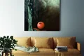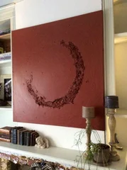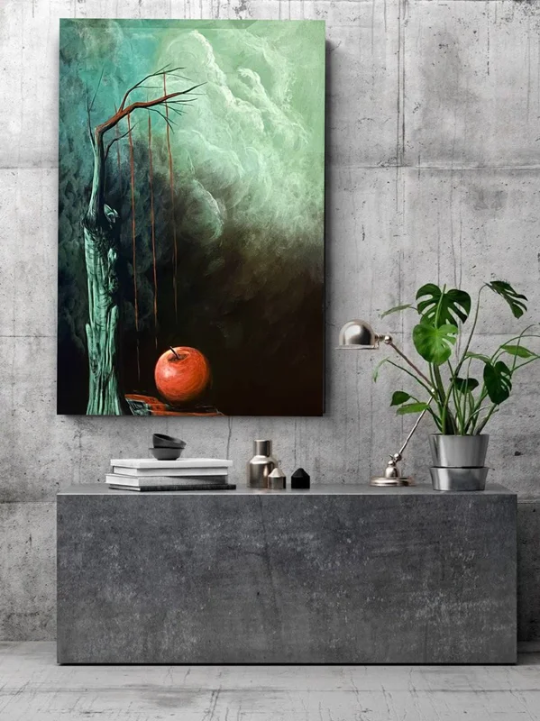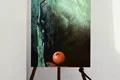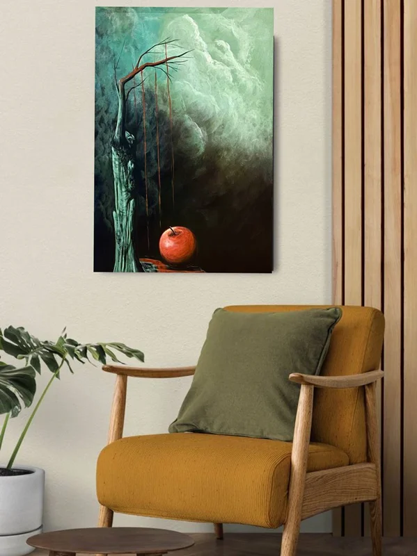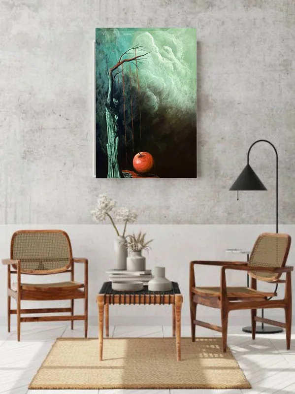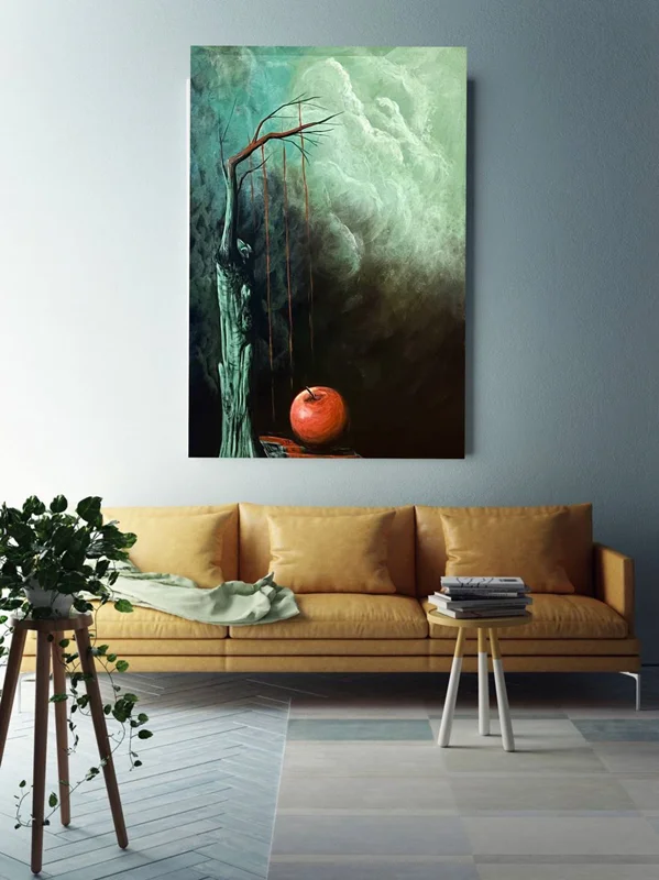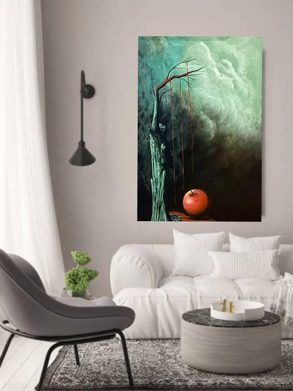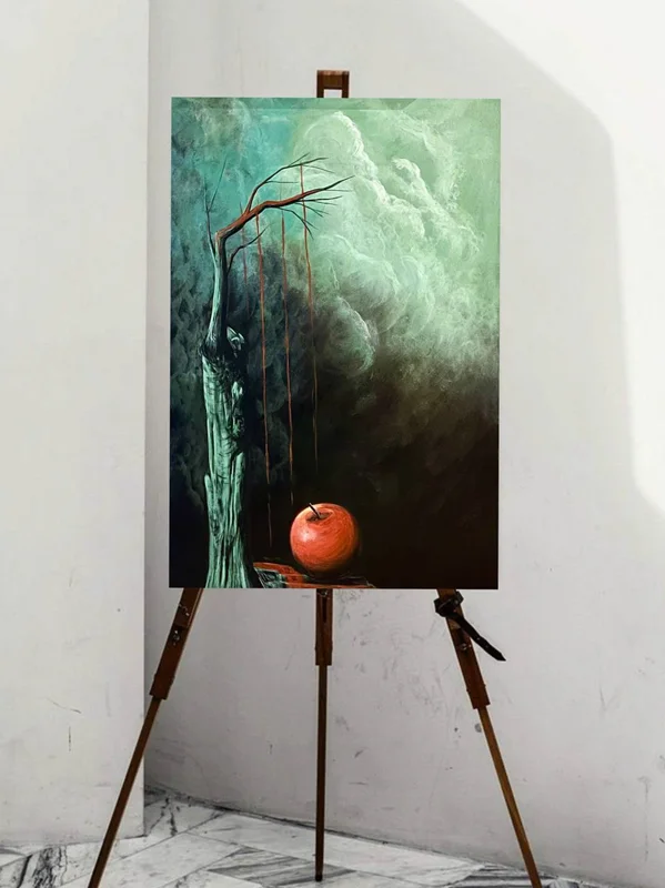 نام اثر: "سیب و سبب "برگرفته از میوه ممنوعه و مصائب آن بر انسانابعاد و تکنیک: اکریلیک روی بوم 60/90.داستان های اساطیری و تاریخی بسیار است؛ به ویژه داستان های پیامبران و پادشاهان و قهرمانان. از میان داستان ها و روایت ها نیز داستان آدم و حوا به ویژه داستان میوه ممنوع از دیرباز در سروده های شاعران بازتاب گسترده ای داشته؛ برجسته ترین تازگی آن نیز جا به جایی میوه ممنوع از گندم به سیب است و این جابه جایی بی گمان پی آمد آشنایی شاعران امروز با ادبیات فرنگ است. از ره آوردهای این جابه جایی نیز کارکردهای نمادین تازه سیب و سبب است که نماد عشق، مهربانی، فریب، وسوسه، گناه و ... است..