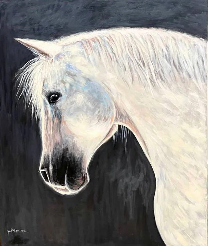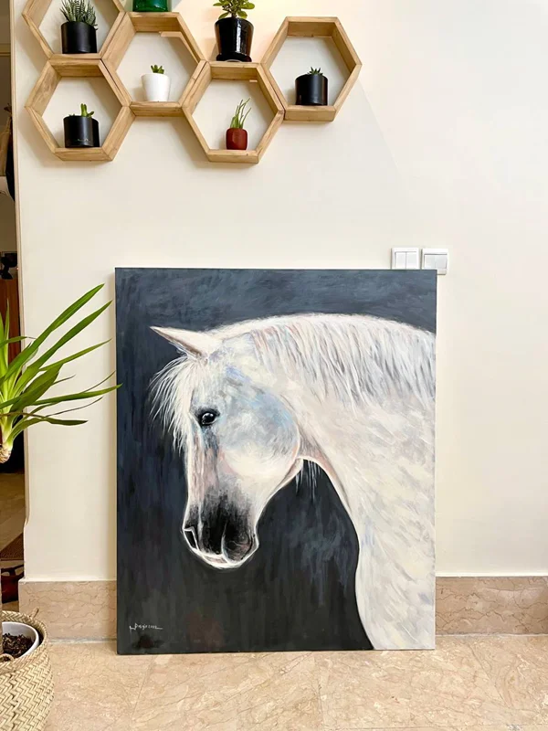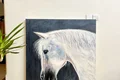 تابلوی سایز بزرگ اسب دکوراتیو 120/100 مناسب برای دکوراسیون داخلی منازل و .. با تم رنگی سفید، طوسی، کرم رنگ و ..